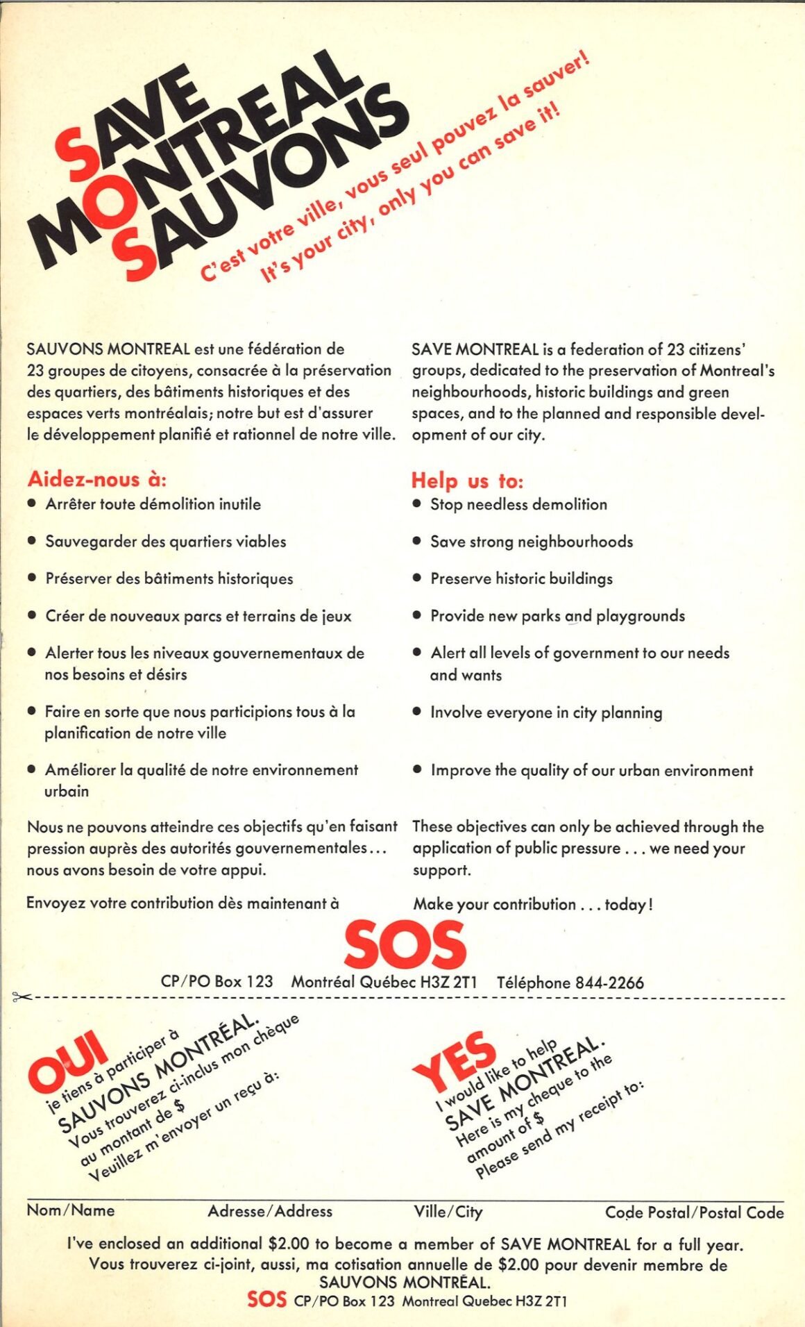 Dans les années 1970, décennie qui voit la naissance de Sauvons Montréal, puis d’Héritage Montréal, le bâti ancien représente une époque dont le modernisme ne veut plus. Les bâtiments sont parfois mal entretenus et ne reflètent pas ce que les administrations en place à l’époque souhaitent pour Montréal. Des bâtiments sont donc démolis, sans égard pour leur valeur patrimoniale et identitaire pour les communautés montréalaises. C’est d’ailleurs à l’occasion de la démolition de la maison Van Horne que le groupe prédécesseur d’Héritage Montréal se forme, pour défendre le patrimoine, mais aussi les citoyen·ne·s dont la vie peut être changée du tout au tout par une expropriation. Les groupes tels que Sauvons Montréal défendent donc l’existence de bâtiments intimement liés au caractère de la métropole québécoise, souhaitant éviter que Montréal devienne une autre ville nord-américaine parmi tant d’autres.