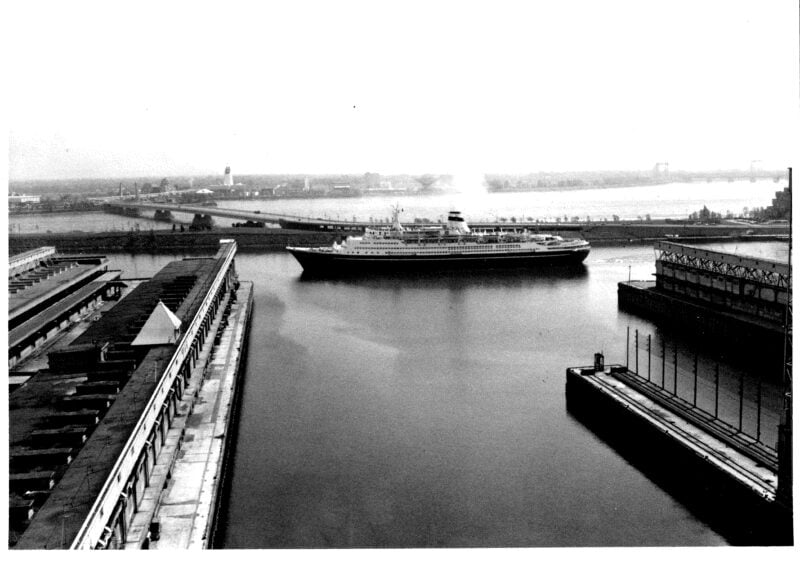 Dans les années 1970, de nombreuses métropoles nord-américaines voient leurs zones portuaires réaménagées. Notamment grâce au travail de Blanche Lemco, architecte et rêveuse de ville, ainsi qu’à son mari Sandy van Ginkel, la vieille ville montréalaise et son front d’eau, sortent de l’oubli et la vision les concernant change. Devant la menace de l’autoroute Ville-Marie, dont le tracé original faisait disparaître le Vieux-Montréal, Lemco et van Ginkel réalisent une étude qui déclenchera une mobilisation citoyenne demandant la protection du secteur. Sous la direction de Mark London, Héritage Montréal produit, en 1983, un pamphlet intitulé Comment doit-on réaménager les ports. Fort de son expérience avec les fronts d’eau d’Halifax et de Toronto, Mark London propose une réflexion sur la diversification des usages du bâti dans les ports et sur l’accessibilité aux fronts d’eau rendue difficile par la présence d’industrie ou par la privatisation des espaces. Mark London pose la question suivante dans le feuillet : Comment faire pour redonner non seulement les percées visuelles aux citoyen·ne·s, mais également rendre l’accès aux centres historiques, souvent construits au bord de l’eau ?