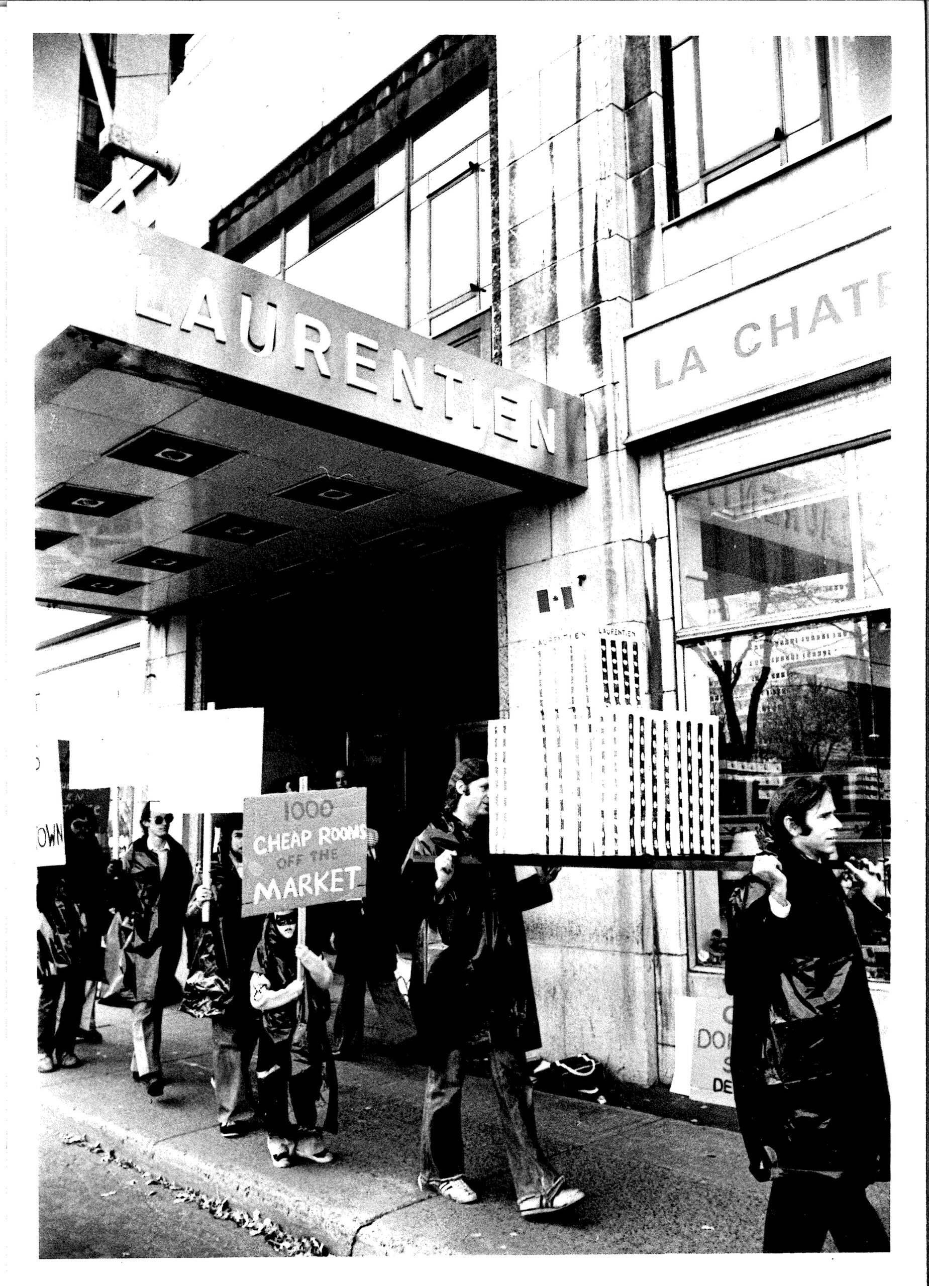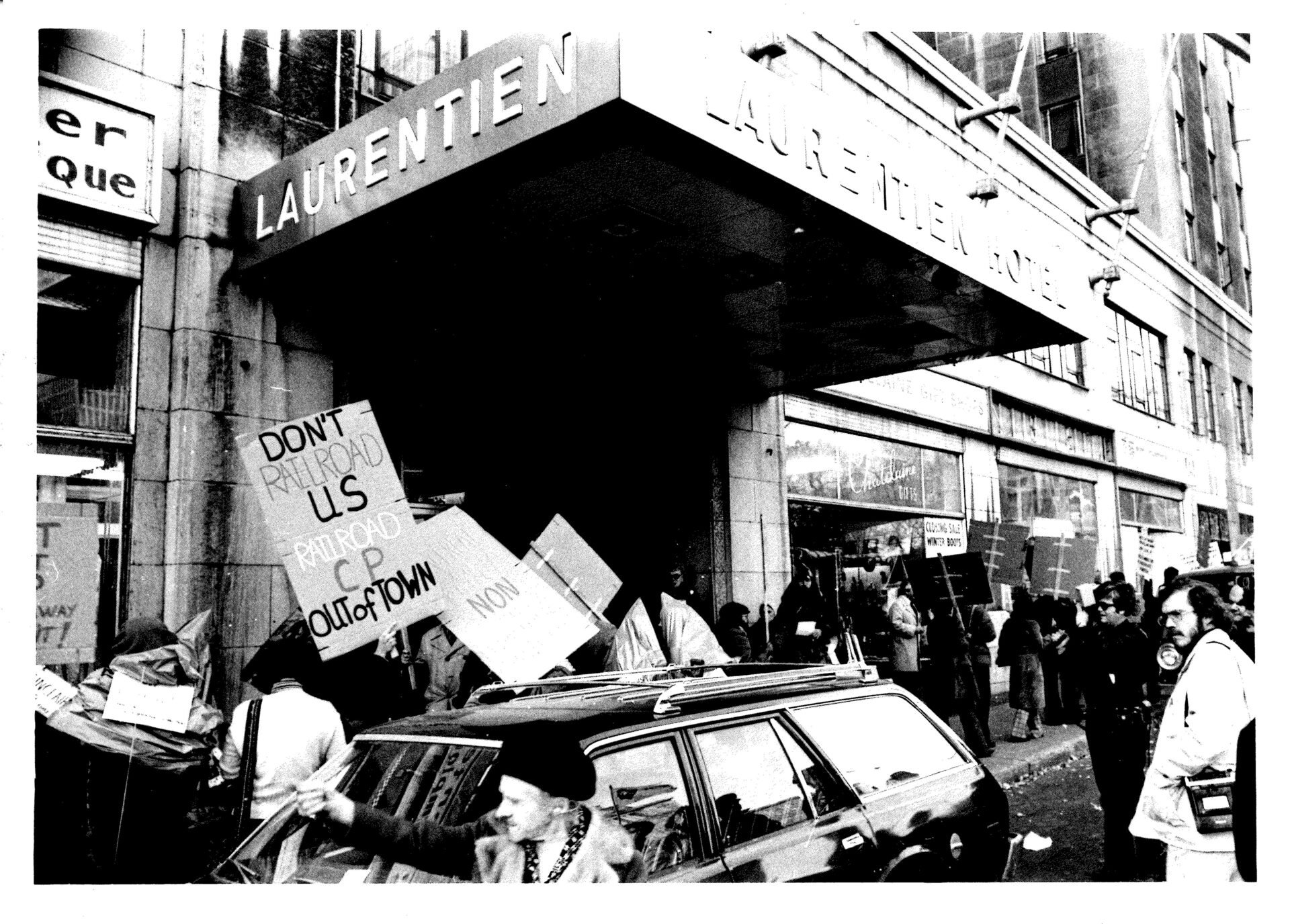 Sauvons Montréal et son organe de financement, Héritage Montréal, participe à l’éveil des consciences face à la démolition des bâtiments historiques. Des rassemblements sont organisés, afin d’en apprendre davantage à la population sur les menaces au bâti, ce qui mène parfois à des manifestations publiques, et organisées. C’est ce qui arrive en octobre 1977, lorsqu’un groupe de personne se présente devant les portes de l’hôtel Laurentien, pour demander sa sauvegarde.